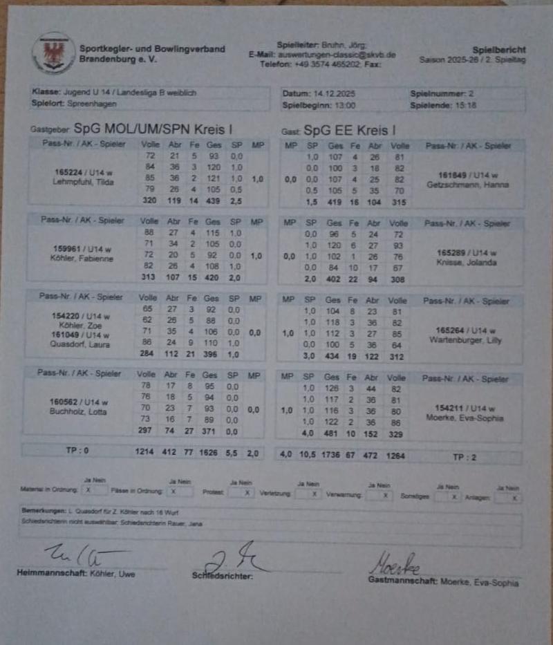 Im zweiten Durchgang überzeugten Lilly Wartenburger mit 434 Holz (1 Mannschaftspunkt) sowie Eva-Sophia Moerke mit hervorragenden 481 Holz (1 Mannschaftspunkt).